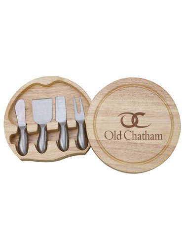 Carve out an interesting niche at the next trade show or convention by selecting this round cheese board. This fancy four-piece set is a must-own for any cheese lover and a great kitchen addition for experts and newbies alike. Have your company name, logo and more engraved on the eye-catching wooden case. For further customization, our giftware can be personalized as well. Dimensions are 8.75" x 1.75". Cater to your cultured clientle with this helpful product!
